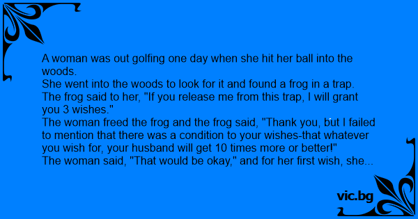 The woman freed the frog and the frog said, "Thank you, but I failed to mention that there was a condition to your wishes-that whatever you wish for, your husband will get 10 times more or better!"