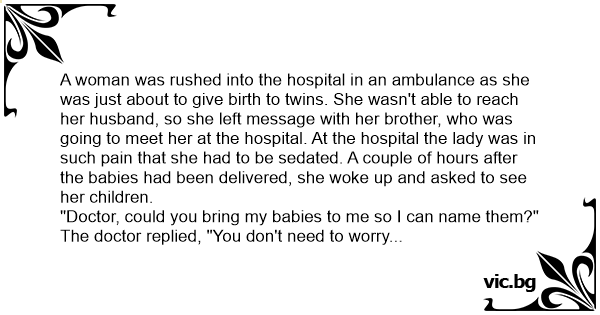 A woman was rushed into the hospital in an ambulance as she was just about to give birth to twins. She wasn't able to reach her husband, so she left message with her brother, who was going to meet her at the hospital. At the hospital the lady was in such pain that she had to be sedated. A couple of hours after the babies had been delivered, she woke up and asked to see her children.