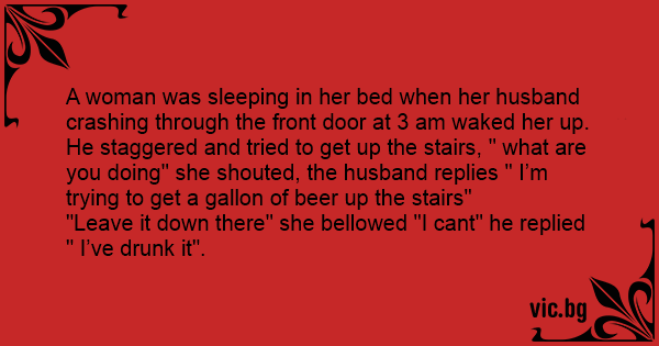A woman was sleeping in her bed when her husband crashing through the front door at 3 am waked her up. He staggered and tried to get up the stairs, " what are you doing" she shouted, the husband replies " I’m trying to get a gallon of вееr up the stairs"