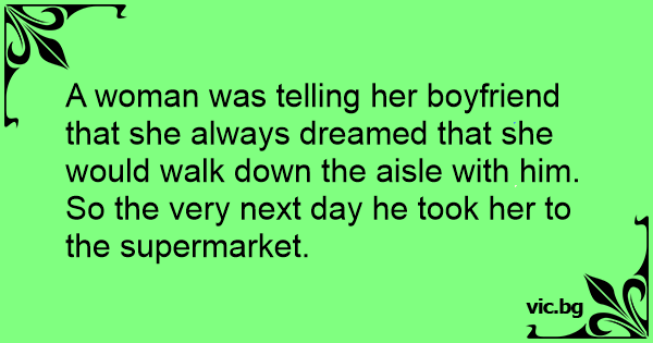 A woman was telling her boyfriend that she always dreamed that she would walk down the aisle with him. So the very next day he took her to the supermarket.