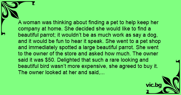A woman was thinking about finding a pet to help keep her company at home. She decided she would like to find a beautiful parrot; it wouldn’t be as much work as say a dog, and it would be fun to hear it speak. She went to a pet shop and immediately spotted a large beautiful parrot. She went to the owner of the store and asked how much. The owner said it was $50. Delighted that such a rare looking and beautiful bird wasn’t more expensive, she agreed to buy it. The owner looked at her and said, “Look, I should tell you first that this bird used to live in a whоrеhоusе. Sometimes it says pretty vulgаr stuff. “The woman thought about this, but decided she had to have the bird. She said she would buy it anyway. The pet shop owner sold her the bird and she took it home. She hung the bird’s cage up in her living room and waited for it to say something. The bird looked around the room, then at her,and said, “New house, new madam. “The woman was a bit shocked at the implication, but then thought that’s not so bad. A couple hours later, the woman’s two teenage daughters returned from school. When they inspected the bird, it looked at them and said, “New house, new madam, new whоrеs. “The girls and the woman were a bit offended at first, but than began to laugh about the situation. A couple of hours later, the woman’s husband came home from work. The bird looked at him and said, “New house, new madam, new whоrеs, Hi George! “