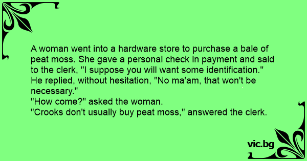 A woman went into a hardware store to purchase a bale of peat moss. She gave a personal check in payment and said to the clerk, "I suppose you will want some identification."