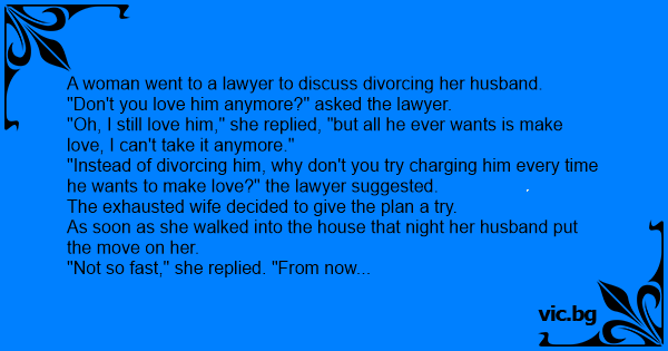 "Instead of divorcing him, why don't you try charging him every time he wants to make love?" the lawyer suggested.