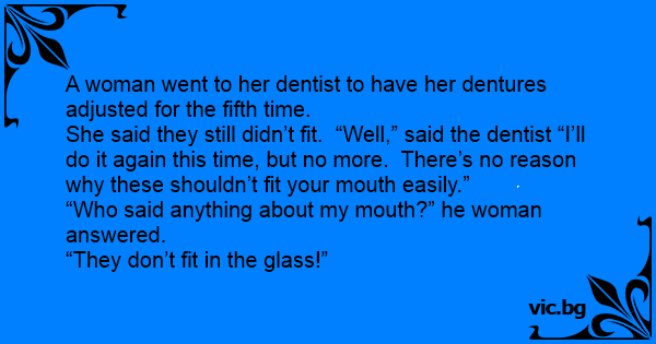 She said they still didn’t fit. “Well,” said the dentist “I’ll do it again this time, but no more. There’s no reason why these shouldn’t fit your mouth easily.”