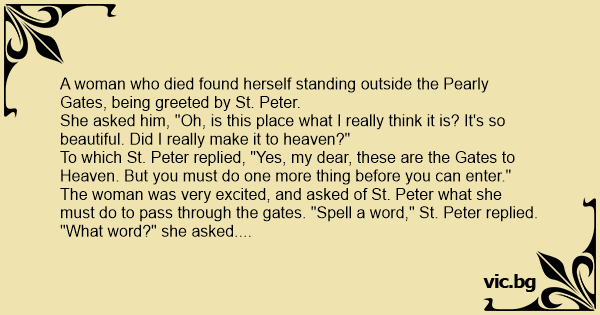 The woman was very excited, and asked of St. Peter what she must do to pass through the gates. "Spell a word," St. Peter replied.