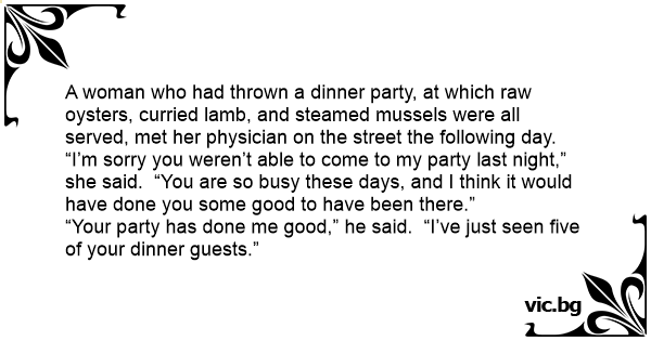 A woman who had thrown a dinner party, at which raw oysters, curried lamb, and steamed mussels were all served, met her physician on the street the following day. “I’m sorry you weren’t able to come to my party last night,” she said. “You are so busy these days, and I think it would have done you some good to have been there.”
