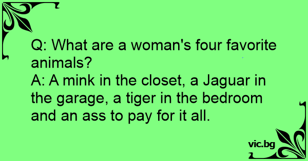 - Melyik az a négy állat, melyet a nők a legjobban szeretnek? - ??? - Egy nerc a szekrényben, egy Jaguár a garázsban, egy bika az ágyban, meg az a marha, aki mindezt fizeti...