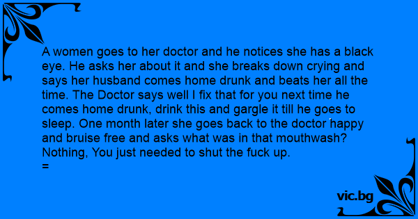 A women goes to her doctor and he notices she has a black eye. He asks her about it and she breaks down crying and says her husband comes home drunк and beats her all the time. The Doctor says well I fix that for you next time he comes home drunк, drink this and gargle it till he goes to sleep. One month later she goes back to the doctor happy and bruise free and asks what was in that mouthwash? Nothing, You just needed to shut the fuск up.