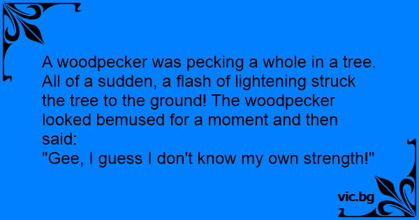 A woodpecker was pecking a whole in a tree. All of a sudden, a flash of lightening struck the tree to the ground! The woodpecker looked bemused for a moment and then said: