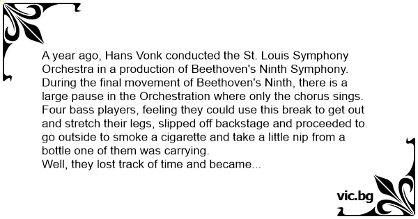 All the bass players had a good chuckle and took a few more swigs and headed in. Once they popped back on stage, they saw that conductor Vonk was absolutely furious. After all, it was the bottom of the Ninth, the basses were loaded, and the score was tied.