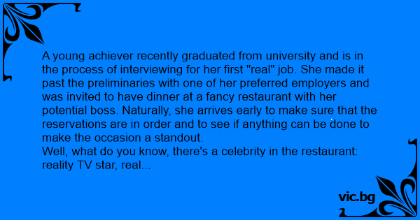A young achiever recently graduated from university and is in the process of interviewing for her first "real" job. She made it past the preliminaries with one of her preferred employers and was invited to have dinner at a fancy restaurant with her potential boss. Naturally, she arrives early to make sure that the reservations are in order and to see if anything can be done to make the occasion a standout.