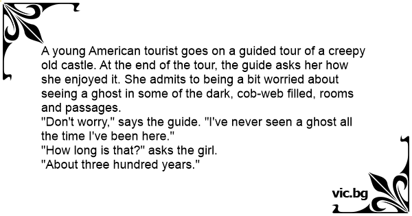 A young American tourist goes on a guided tour of a creepy old castle. At the end of the tour, the guide asks her how she enjoyed it. She admits to being a bit worried about seeing a ghost in some of the dark, cob-web filled, rooms and passages.