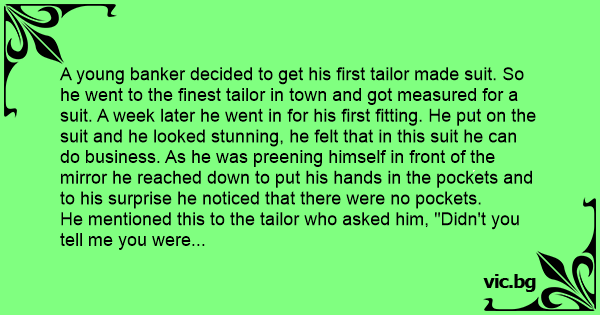 A young banker decided to get his first tailor made suit. So he went to the finest tailor in town and got measured for a suit. A week later he went in for his first fitting. He put on the suit and he looked stunning, he felt that in this suit he can do business. As he was preening himself in front of the mirror he reached down to put his hands in the pockets and to his surprise he noticed that there were no pockets.