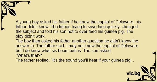A young boy asked his father if he knew the capitol of Delaware, his father didn’t know. The father, trying to save face quickly, changed the subject and told his son not to over feed his guinea pig. The ploy didn’t work.