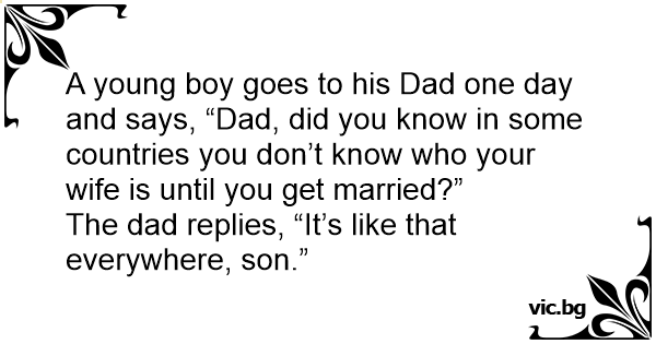 A young boy goes to his Dad one day and says, “Dad, did you know in some countries you don’t know who your wife is until you get married?”