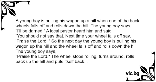"You should not say that. Next time your wheel falls off say, 'Praise the Lord.'" So the next day the young boy is pulling his wagon up the hill and the wheel falls off and rolls down the hill. The young boy says,