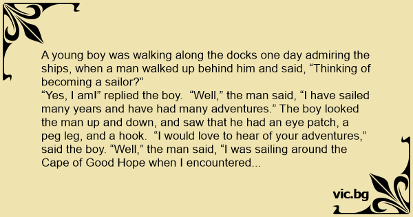“Yes, I am!” replied the boy. “Well,” the man said, “I have sailed many years and have had many adventures.” The boy looked the man up and down, and saw that he had an eye patch, a peg leg, and a hook. “I would love to hear of your adventures,” said the boy. “Well,” the man said, “I was sailing around the Cape of Good Hope when I encountered pirates. They boarded my boat and I fought them 'til there was only one left. But before he got away he cut off my leg!”