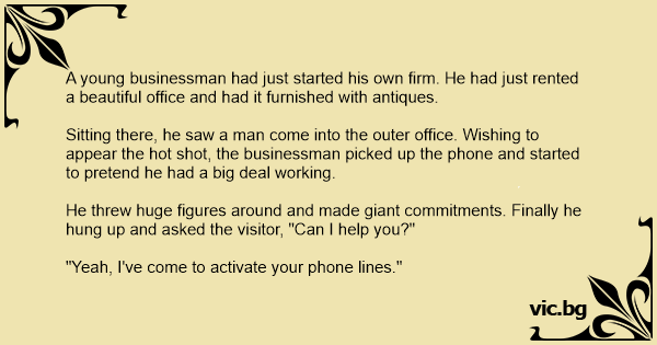 Sitting there, he saw a man come into the outer office. Wishing to appear the hot shot, the businessman picked up the phone and started to pretend he had a big deal working.