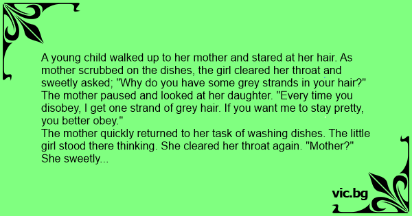 The mother paused and looked at her daughter. "Every time you disobey, I get one strand of grey hair. If you want me to stay pretty, you better obey."