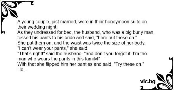 As they undressed for bed, the husband, who was a big burly man, tossed his pants to his bride and said, "here put these on."