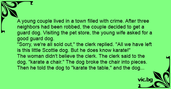 The woman didn't believe the clerk. The clerk said to the dog, "karate a chair." The dog broke the chair into pieces. Then he told the dog to "karate the table," and the dog quickly broke the table in half. So the woman bought the dog and took it home. Her husband was disappointed and skeptical about the Scottie dog's abilities as a guard dog. The wife told him about the dog's excellent karate skills.