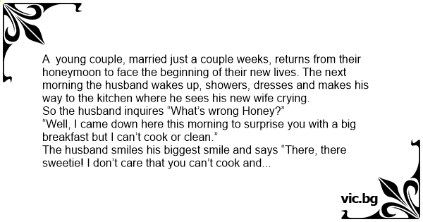 That afternoon, the husband comes home for lunch to find his new wife crying again in the kitchen. “What’s wrong now Sweetie?”
