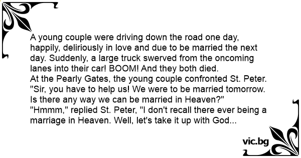 At the Pearly Gates, the young couple confronted St. Peter. "Sir, you have to help us! We were to be married tomorrow. Is there any way we can be married in Heaven?"