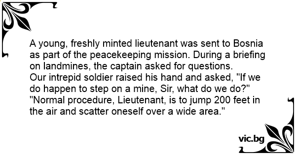 - Пане майор, а що робити, якщо я раптом наступлю на міну? - Стандартна процедура, рядовий. Доведеться підстрибнути на 30 метрів вгору і розповсюдитись по широкій території.