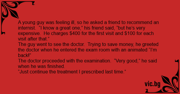 The guy went to see the doctor. Trying to save money, he greeted the doctor when he entered the exam room with an animated “I’m back!”