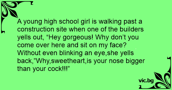 A young high school girl is walking past a construction site when one of the builders yells out, “Hey gorgeous! Why don’t you come over here and sit on my face?