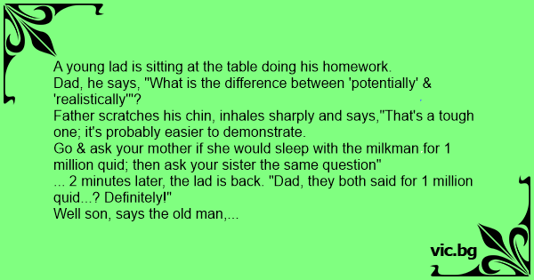 Un adolescent demande à son père : - Papa qu'est est la différence entre réellement et potentiellement ? Le père : - Va demander à ta soeur et à ta mère si elles veulent coucher avec le voisin....