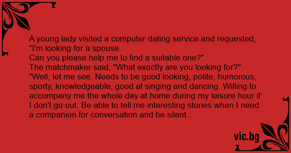 A young lady visited a computer dating service and requested, "I'm looking for a spouse.