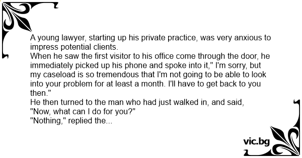 When he saw the first visitor to his office come through the door, he immediately picked up his phone and spoke into it," I'm sorry, but my caseload is so tremendous that I'm not going to be able to look into your problem for at least a month. I'll have to get back to you then."