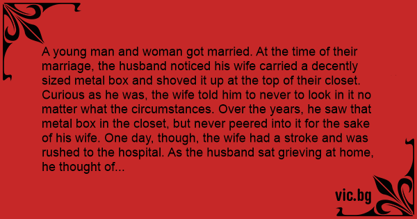 A young man and woman got married. At the time of their marriage, the husband noticed his wife carried a decently sized metal box and shoved it up at the top of their closet. Curious as he was, the wife told him to never to look in it no matter what the circumstances. Over the years, he saw that metal box in the closet, but never peered into it for the sake of his wife. One day, though, the wife had a sтrоке and was rushed to the hospital. As the husband sat grieving at home, he thought of the box, snatched it up, and sped to the hospital where his wife remained with her death coming soon. The husband bolted to her hospital room and pleaded and begged her to allow him to open the box by her side. "Well" she said,