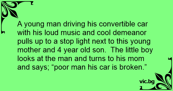 A young man driving his convertible car with his loud music and cool demeanor pulls up to a stop light next to this young mother and 4 year old son. The little boy looks at the man and turns to his mom and says; “poor man his car is broken.”