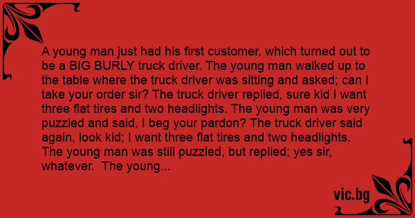 A young man just had his first customer, which turned out to be a BIG BURLY truck driver. The young man walked up to the table where the truck driver was sitting and asked; can I take your order sir? The truck driver replied, sure kid I want three flat tires and two headlights. The young man was very puzzled and said, I beg your pardon? The truck driver said again, look kid; I want three flat tires and two headlights. The young man was still puzzled, but replied; yes sir, whatever. The young man then took the request to his boss who was the head cook. He told him about the truck driver's order, and that he wanted three flat tires and two headlights, “I think he's in the wrong place.” The head cook said, I know what he wants, he wants three flap jacks and two eggs sunny side up; the truck driver is just trying to be smart, I know him. The cook said to the waiter here, take this bowl of beans, give it to him and say this. The truck driver said, Listen kid, I didn't order this; I said I wanted three flat tires and two headlights. The waiter replied, Well sir, the head cook said while you wait for your parts, you can gas up!