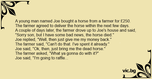 A month Later, the farmer met up with Joe and asked, "What happened with that dead horse?"
