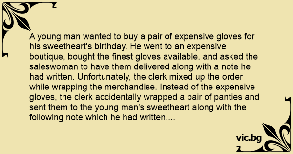Mлад мъж искал да купи подарък за рождения ден на новата си приятелката, но тъй като излизали съвсем отскоро, дълго се колебал и решил, че чифт ръкавици носят най-подходящото послание: