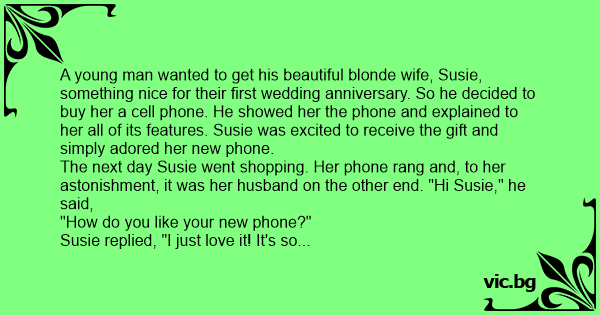 A young man wanted to get his beautiful blonde wife, Susie, something nice for their first wedding anniversary. So he decided to buy her a cell phone. He showed her the phone and explained to her all of its features. Susie was excited to receive the gift and simply adored her new phone.