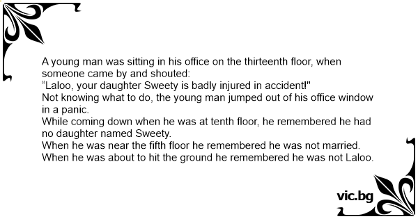 A young man was sitting in his office on the thirteenth floor, when someone came by and shouted: