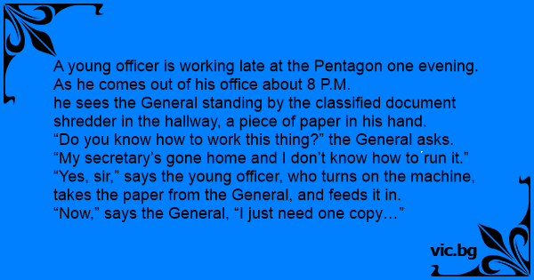 Шеф засовує листочок в знищувач документів і запитує у секретарки: — Світлано, куди тут потрібно ... — Он ту кнопочку натисніть. Натискає. — Світлано, мені 3 копії треба ...