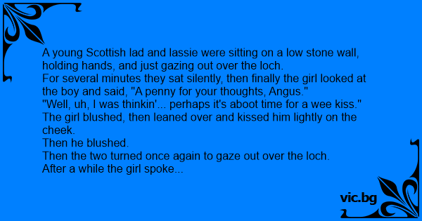 A young Scottish lad and lassie were sitting on a low stone wall, holding hands, and just gazing out over the loch.