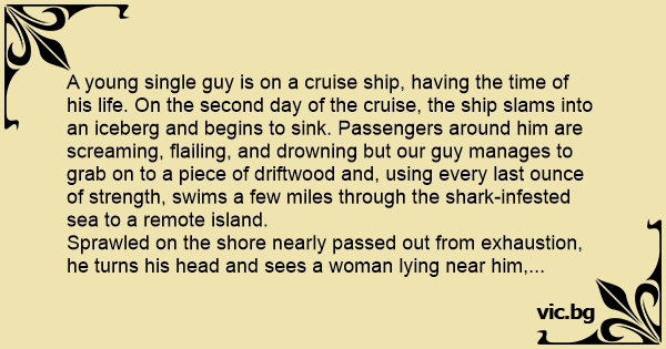A young single guy is on a cruise ship, having the time of his life. On the second day of the cruise, the ship slams into an iceberg and begins to sink. Passengers around him are screaming, flailing, and drowning but our guy manages to grab on to a piece of driftwood and, using every last ounce of strength, swims a few miles through the shark-infested sea to a remote island.