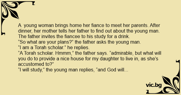 “A Torah scholar. Hmmm,” the father says. “admirable, but what will you do to provide a nice house for my daughter to live in, as she’s accustomed to?”