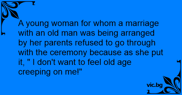 A young woman for whom a marriage with an old man was being arranged by her parents refused to go through with the ceremony because as she put it, " I don't want to feel old age creeping on me!"