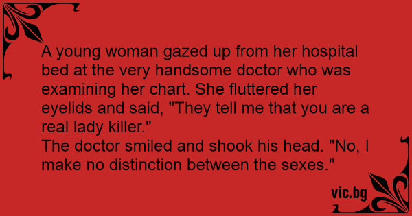 A young woman gazed up from her hospital bed at the very handsome doctor who was examining her chart. She fluttered her eyelids and said, "They tell me that you are a real lady killer."