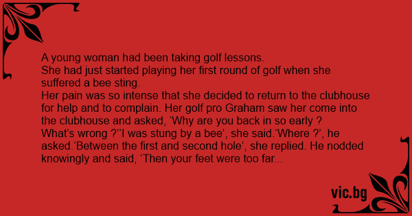 What’s wrong ?’‘I was stung by a bee’, she said.‘Where ?’, he asked.‘Between the first and second hole’, she replied. He nodded knowingly and said, ‘Then your feet were too far apart.’