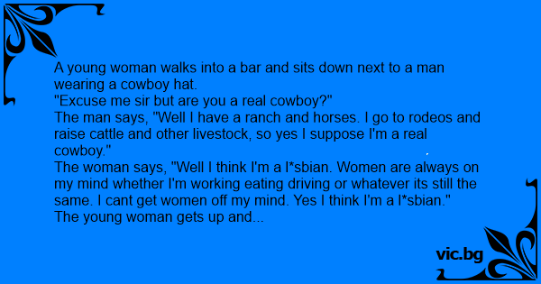 Sjedi kauboj u birtiji i prilazi mu lezbijka: Kauboj: - "Ko si ti?" "Lezbijka." "Šta ti to znači?" "Po čitav dan mislim na žene i kad jedem mislim na žene i kad pijem mislim na žene i kad se...