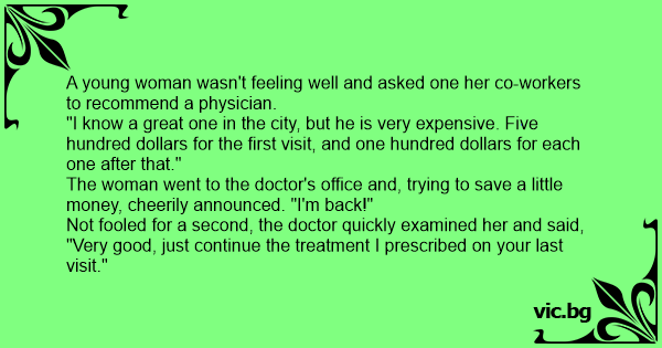 The woman went to the doctor's office and, trying to save a little money, cheerily announced. "I'm back!"