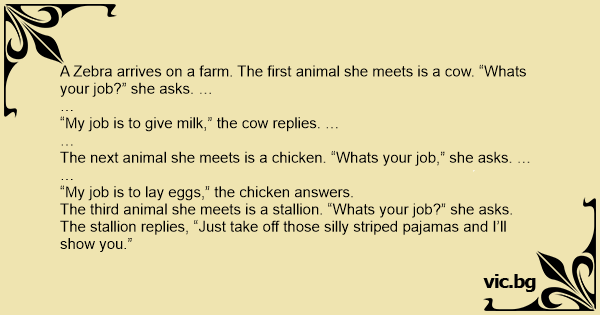 A Zebra arrives on a farm. The first animal she meets is a соw. “Whats your job?” she asks. …